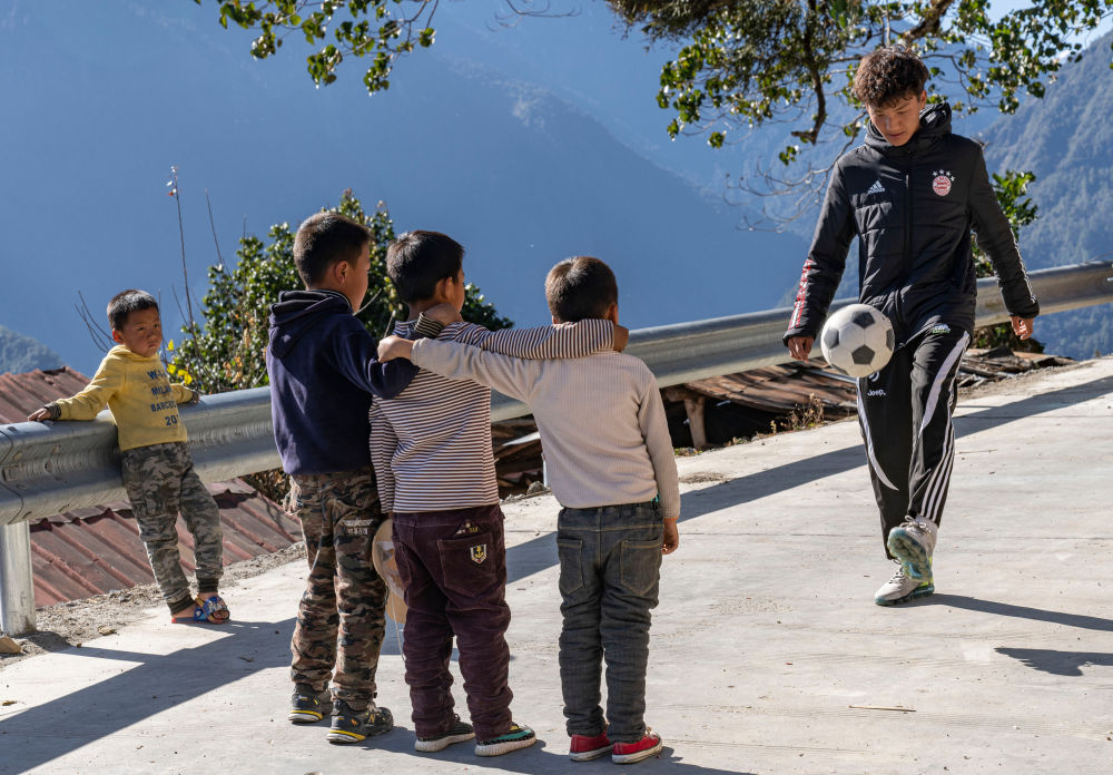 在西藏林芝市墨脫縣德興鄉(xiāng)巴登則村,旺前羅布向弟弟們展示自己的球技(2021年2月9日攝)。新華社記者 孫非 攝
