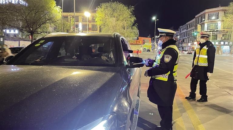 拉薩冬日的夜晚寒風凜冽。夜色中,一輛輛汽車有序通行,街道又恢復了往日的熱鬧。當天晚上9時許,記者跟隨拉薩市公安局交警支隊執(zhí)法監(jiān)督大隊民警前往江蘇大道,城南大隊的民警已經設置好路障、標牌,正在對過往車輛逐一進行詳細排查?!澳?,請出示駕照?!薄澳?,請吹氣。”在民警的指揮下,車輛有序通過檢查點。市民扎西多吉駕車經過檢查點后告訴記者,在這么冷的天氣里,交警依然堅守在路面上,確實令人敬佩,應該為他們點贊。“我會牢記‘開車不喝酒,喝酒不開車’,也會自覺遵守交通法律法規(guī),文明出行?!痹鞫嗉f。