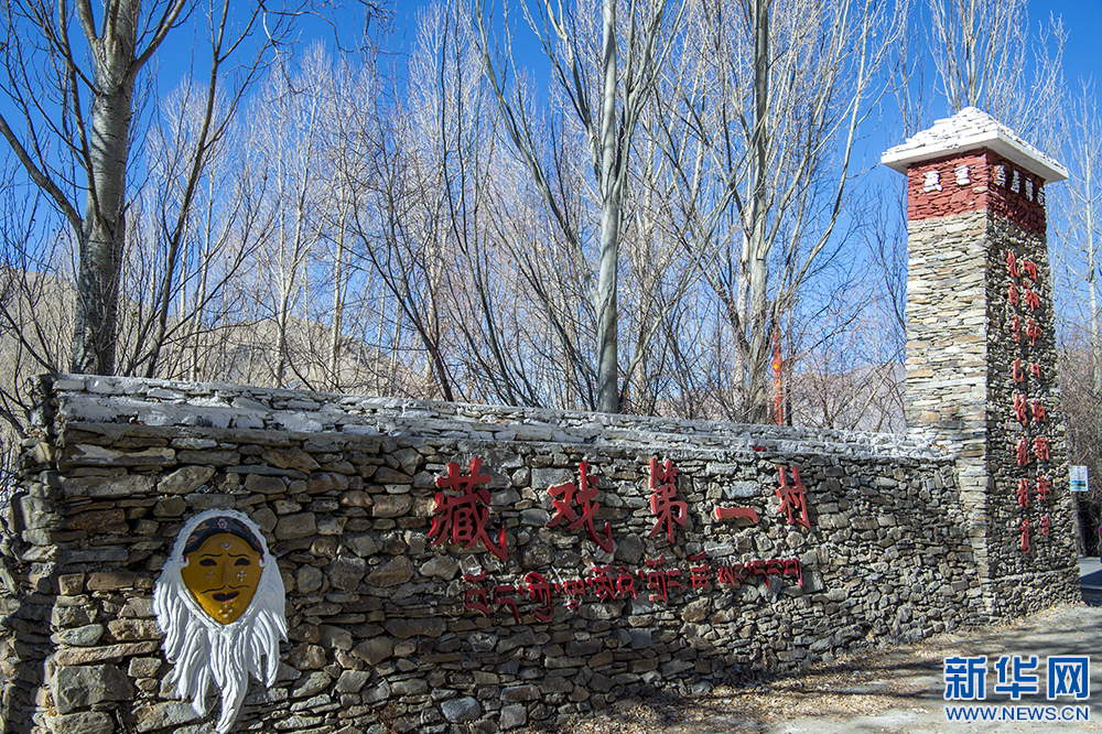 圖為扎西曲登社區(qū)大門旁的雅礱扎西雪巴藏戲面具和標語(12月9日攝)。新華網(wǎng) 旦增努布 攝