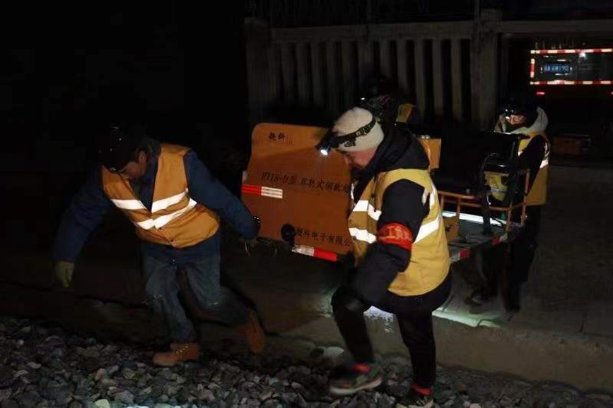 “大家?guī)Ш霉ぞ卟牧希瑴?zhǔn)備出發(fā)?!?2時(shí)整,隨著作業(yè)負(fù)責(zé)人探傷工區(qū)工長(zhǎng)羅布一聲令下,呼嘯的寒風(fēng)中,黃色的“迷你敞篷車”緩緩啟動(dòng),載著4名職工,開(kāi)始了當(dāng)晚對(duì)拉林鐵路20多公里線路的探傷檢查任務(wù)。