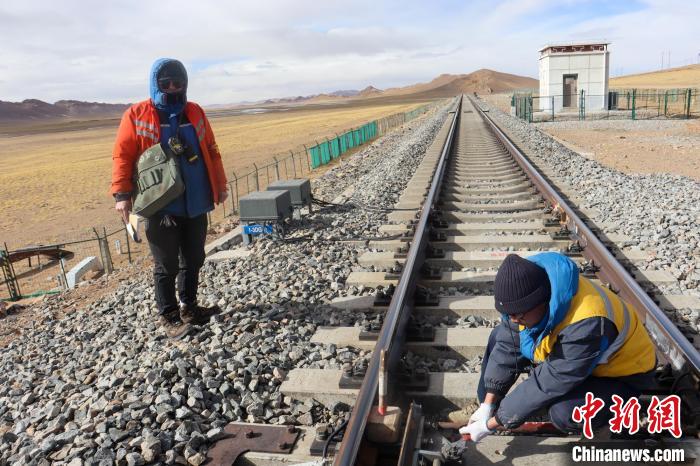冬季西藏那曲寒風凜冽,工長楊建青(右)加固道岔安裝螺絲。 馬生明 攝
