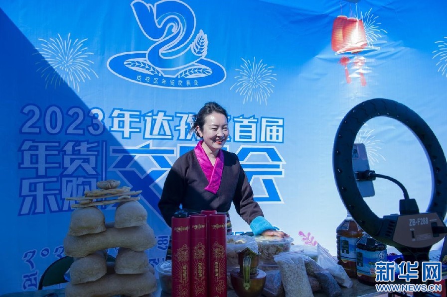 2月6日,商戶在交易會(huì)上通過(guò)直播介紹年貨。新華網(wǎng) 旦增努布 攝