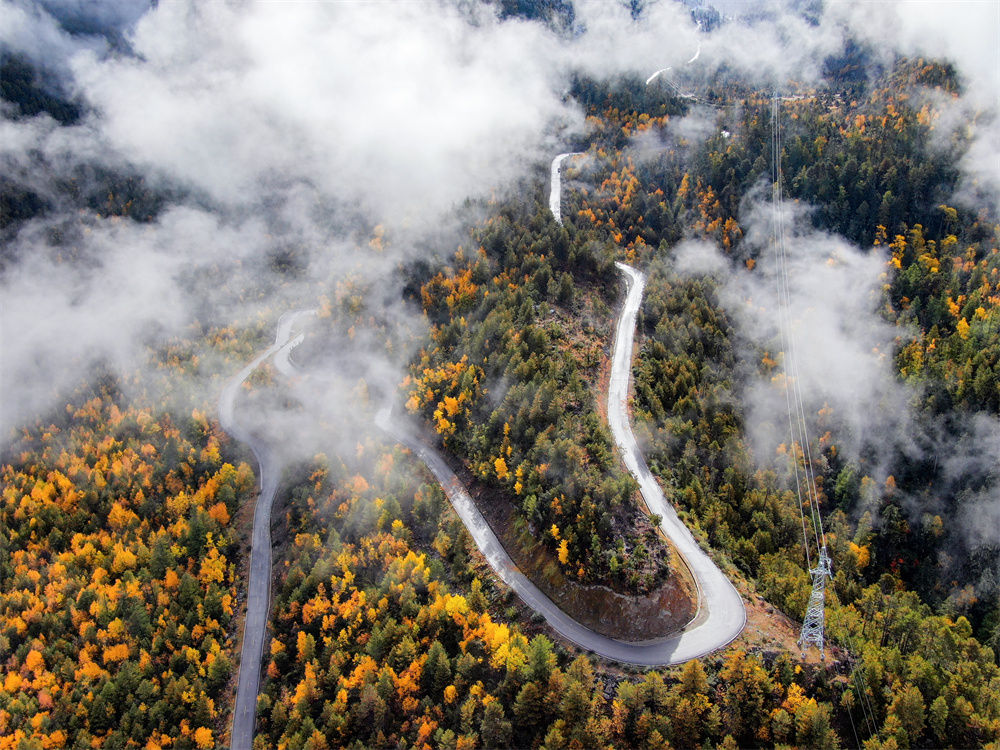 2020年11月5日拍攝的派墨公路米林段一景(無(wú)人機(jī)照片)。新華社發(fā)(董志雄 攝)