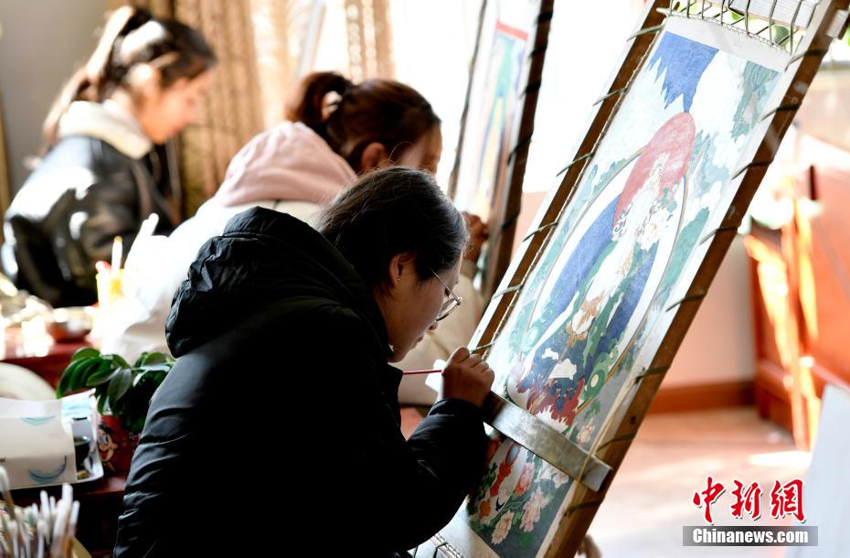 隨著經(jīng)濟(jì)社會的發(fā)展,在對非物質(zhì)文化遺產(chǎn)傳承越來越重視的背景下,也有了越來越多的西藏女性學(xué)習(xí)唐卡繪畫。她們在實(shí)現(xiàn)自己夢想的同時,也為民族文化的傳承與發(fā)展貢獻(xiàn)著“巾幗力量”。圖為3月8日,西藏唐卡畫院內(nèi)正在繪制唐卡的女學(xué)生。