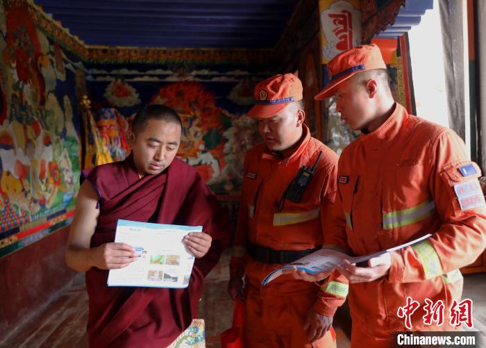 “景區(qū)內(nèi)的宗教寺廟木質(zhì)結(jié)構(gòu)比較多,周圍森林資源豐富,平時要注意用火安全,防止火災(zāi)發(fā)生?!边@是林芝市森林支隊消防員正在為德木寺景區(qū)工作人員和僧人宣傳森林消防安全常識。