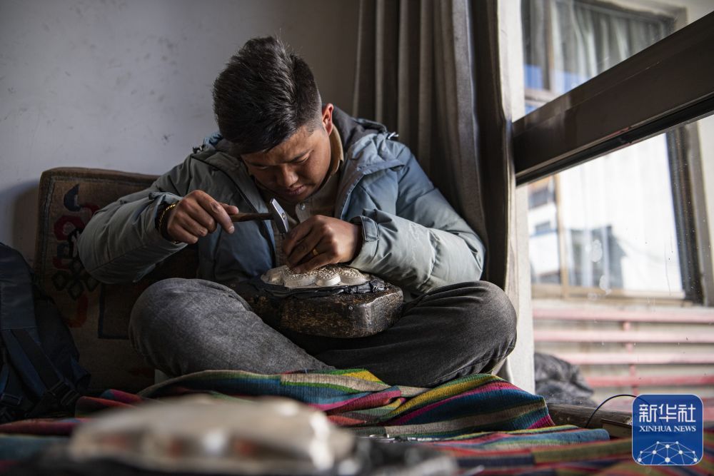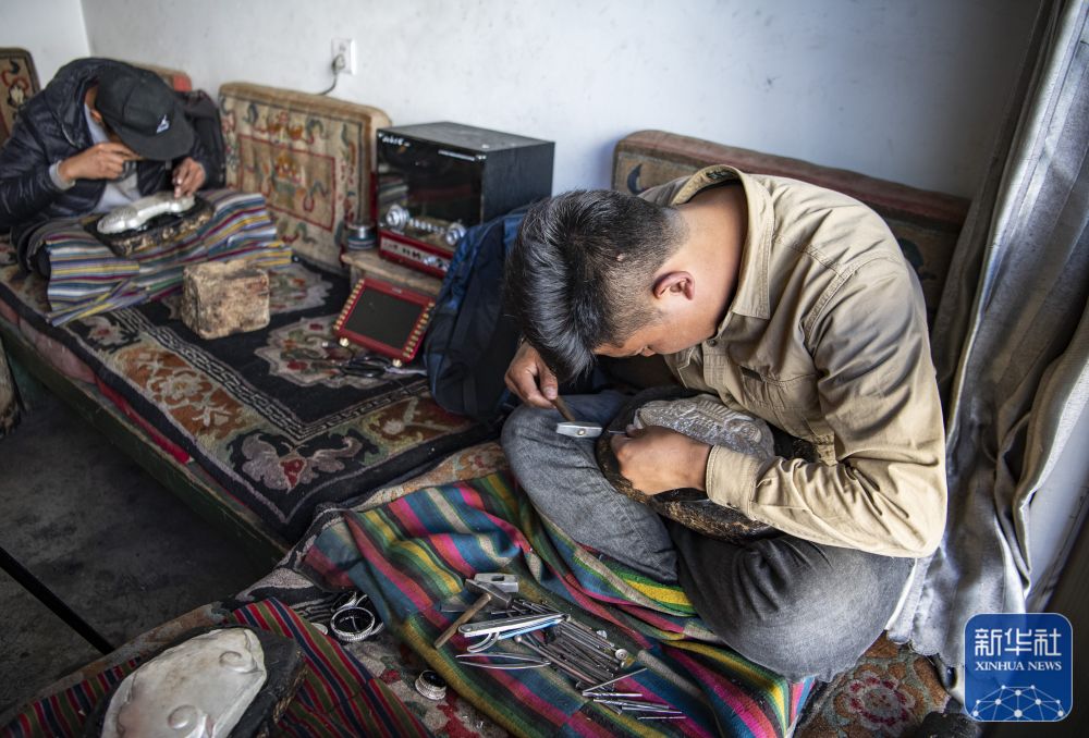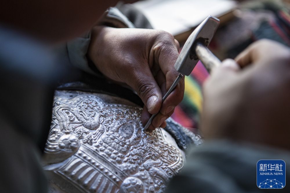 在扎西吉彩金銀銅器廠,手工藝人在給銀器鏨刻花紋(3月9日攝)。