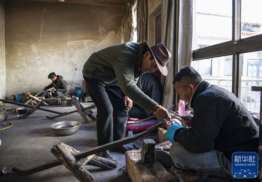 在扎西吉彩金銀銅器廠,廠長(zhǎng)拉巴瓊達(dá)(前左)在指導(dǎo)年輕的手工藝人(3月9日攝)。
