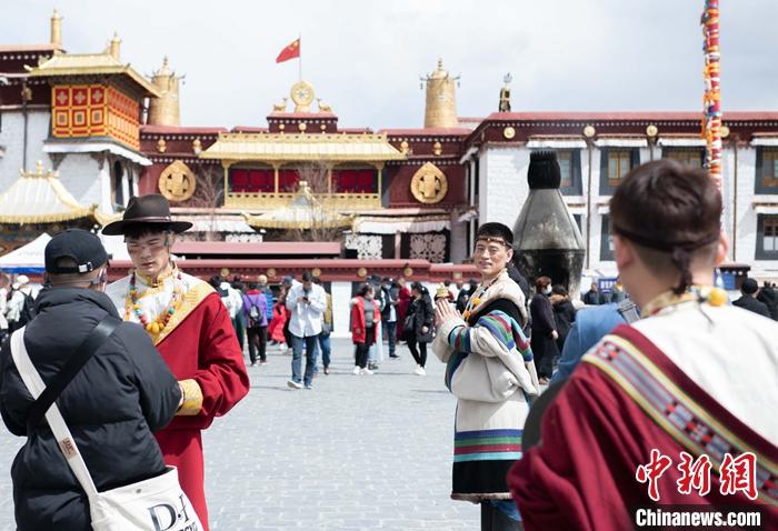 3月14日,游客穿上藏族傳統(tǒng)服飾在拉薩市八廓街拍照留念。 中新社記者 貢嘎來松 攝