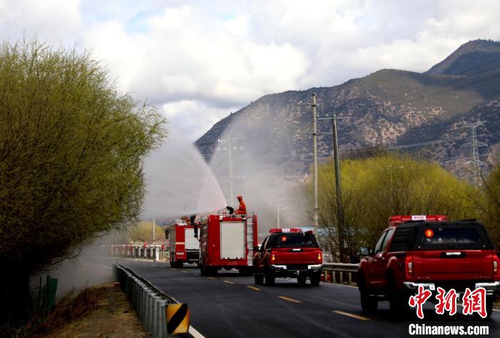 林芝市森林消防支隊消防員正在進(jìn)行灑水增濕作業(yè)。西繞拉翁 攝