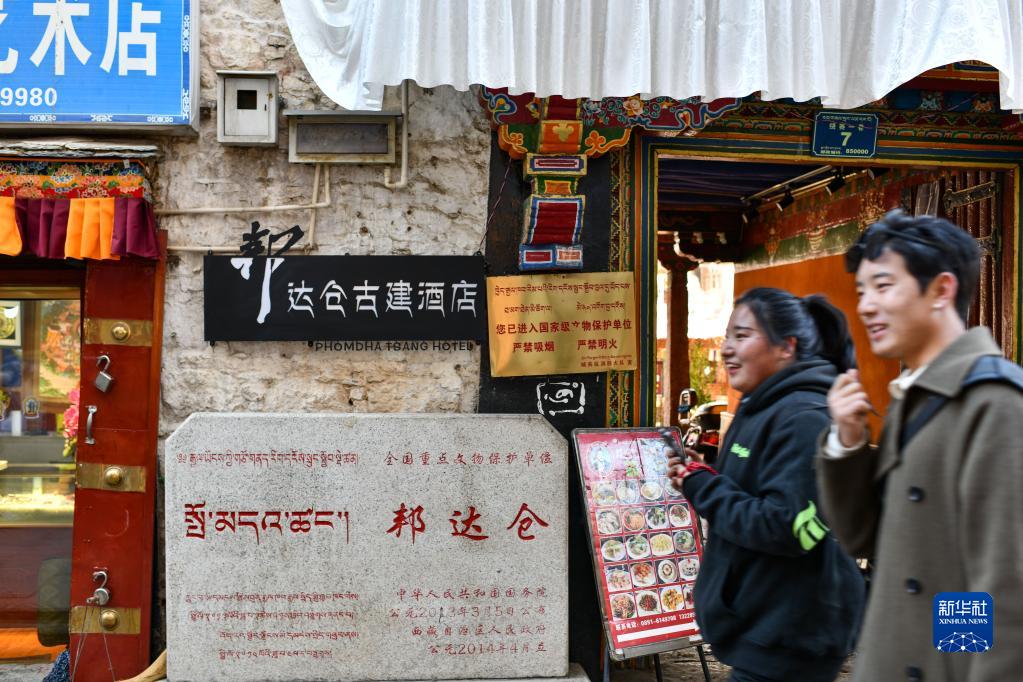 西藏拉薩市民走過八廓街老城區(qū)邦達倉古建酒店(2023年3月24日攝)。新華社記者 晉美多吉 攝