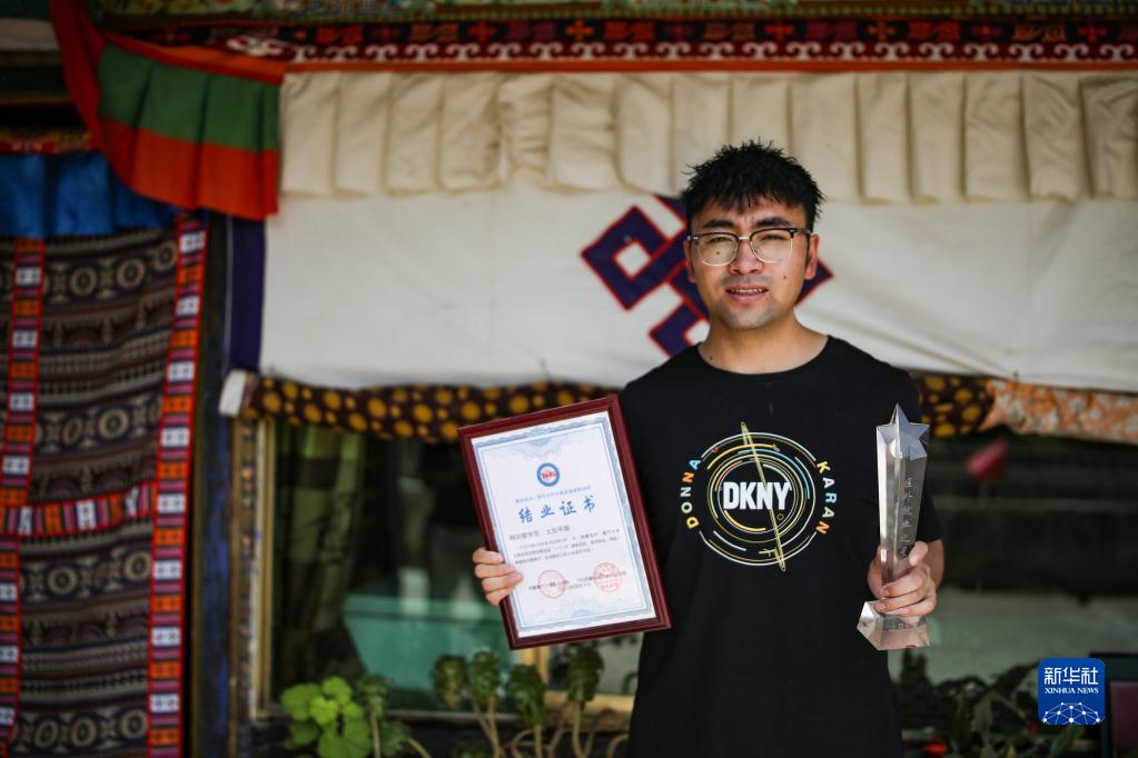 “格?;ㄩ_”大學生就業(yè)創(chuàng)業(yè)特訓營學員、江蘇今世緣酒業(yè)股份有限公司甘青藏大區(qū)業(yè)務經(jīng)理土旦平措展示特訓營結業(yè)證書和“區(qū)外就業(yè)之星”獎杯(2022年6月23日攝)。新華社記者 姜帆 攝