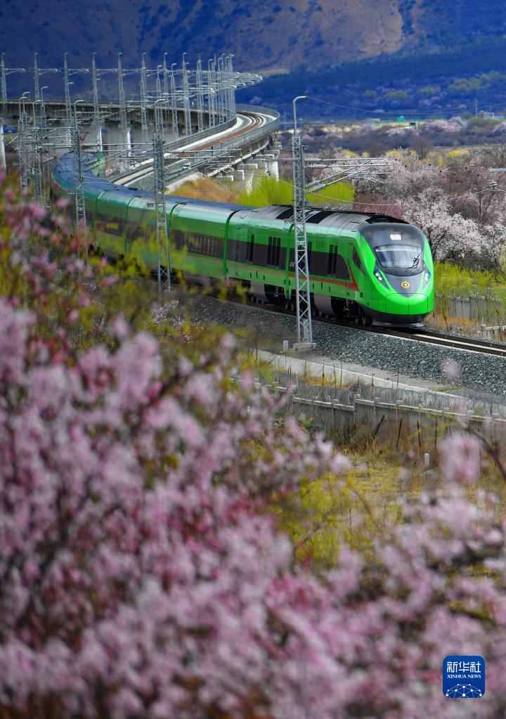 復興號穿行在西藏拉林鐵路林芝段的桃花間(2023年3月21日攝)。新華社記者 覺果 攝