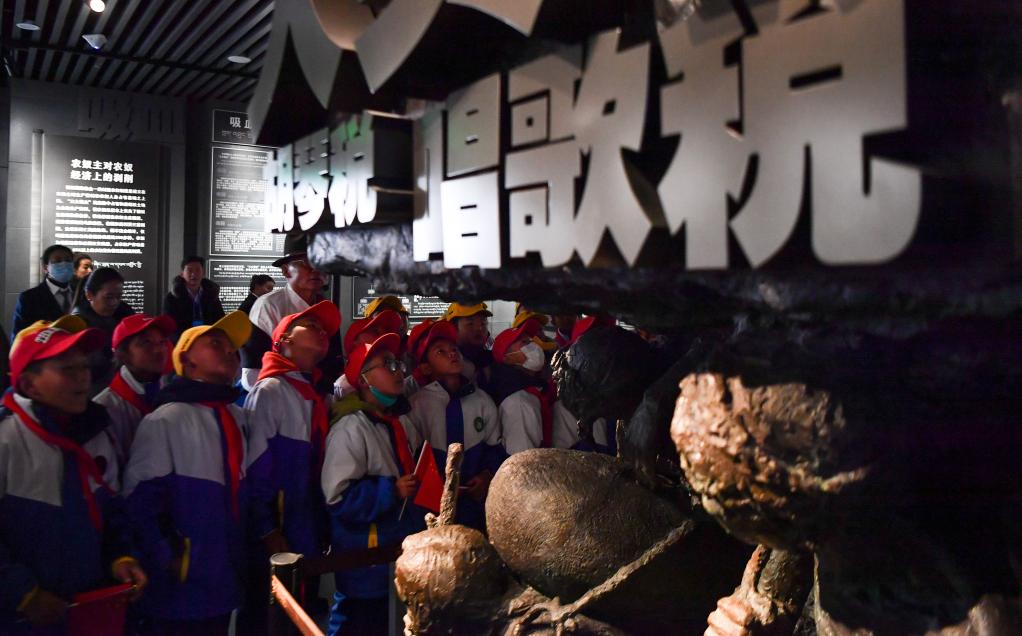 拉薩市堆龍德慶區(qū)乃瓊中心小學(xué)的學(xué)生在參觀西藏百萬(wàn)農(nóng)奴解放紀(jì)念館(3月28日攝)。新華社記者晉美多吉 攝