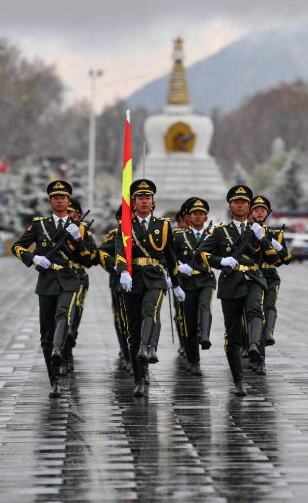 國(guó)旗護(hù)衛(wèi)隊(duì)邁著整齊劃一的步伐,把五星紅旗送到廣場(chǎng)升旗處(3月28日攝)。新華社記者晉美多吉 攝
