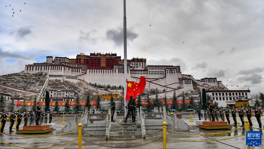 3月28日,拉薩布達(dá)拉宮廣場(chǎng)舉行升旗儀式。新華社記者 晉美多吉 攝