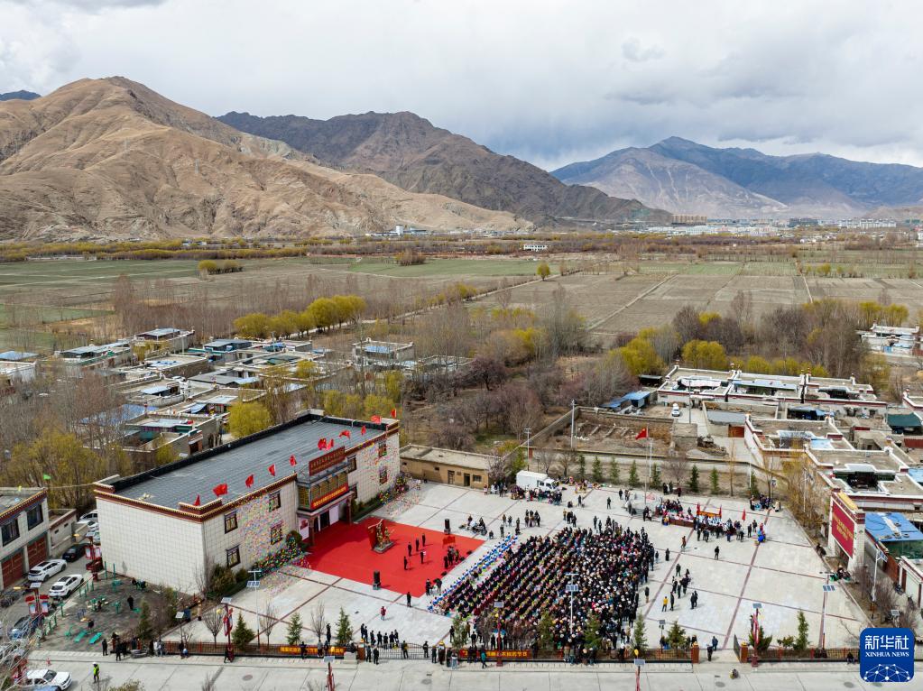 3月28日,在山南市乃東區(qū),西藏民主改革第一村陳列館重新開(kāi)放,人們?cè)陉惲叙^前舉行儀式,紀(jì)念西藏百萬(wàn)農(nóng)奴解放64周年(無(wú)人機(jī)照片)。新華社記者 孫非 攝