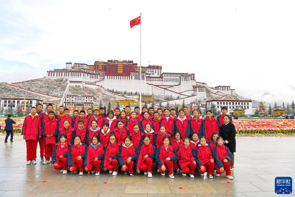 3月28日,在拉薩布達(dá)拉宮,參加升旗儀式的師生在廣場(chǎng)合影留念。新華社記者 張汝鋒 攝