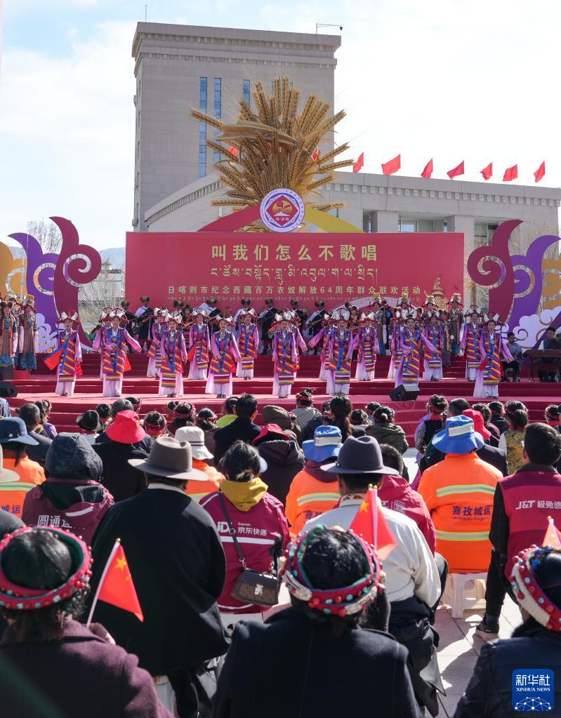 當(dāng)日,西藏各族各界群眾升國(guó)旗、唱國(guó)歌,載歌載舞,隆重紀(jì)念西藏百萬(wàn)農(nóng)奴解放64周年。