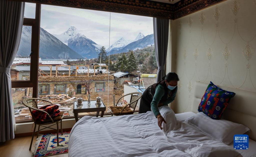 央金措姆在自己家的民宿中打掃房間,窗外是湖光山色(3月19日攝)。新華社記者姜帆 攝