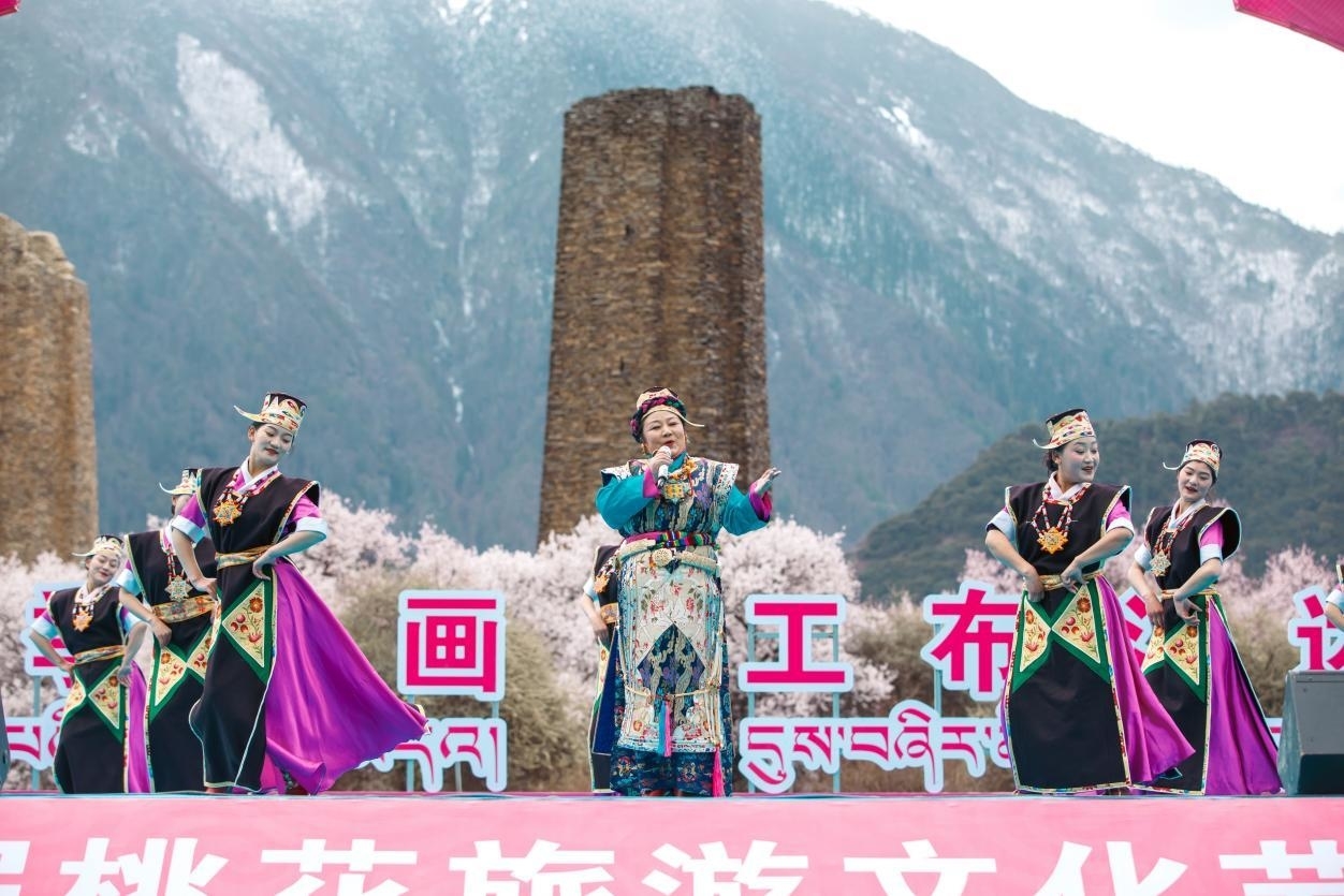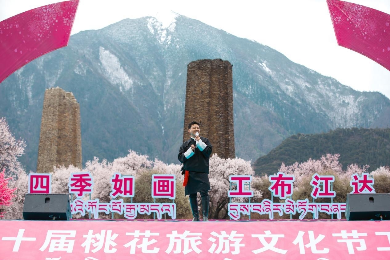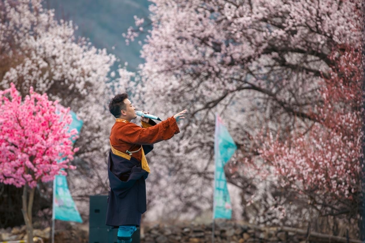 皚皚雪山下,千年古堡旁,灼灼桃花,花開正艷。羅布桑珠、巴金旺甲、齊旦布、桑杰才讓等藏族知名歌手、工布江達本地歌手、當?shù)厝罕婟R聚,流行歌曲與工布民歌等當?shù)靥厣硌萁Y合,為網(wǎng)友們獻上了一場桃花樹下的歌舞盛宴。