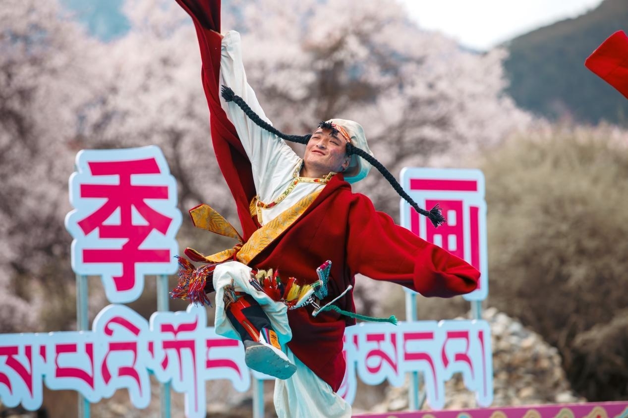 上午10:00開始的的群眾文藝聯(lián)歡會,以歡快的《飲酒踏》開場,尼洋河水吟唱春日韻律,米拉雪山涌動喜慶樂曲。
