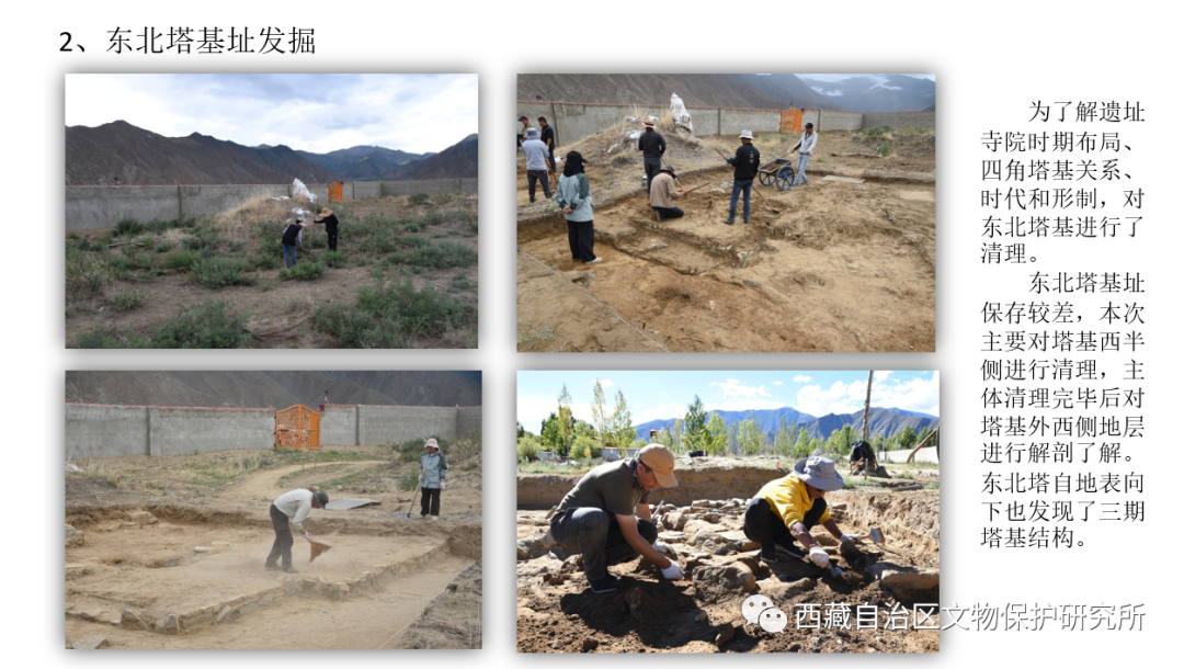 本年度基本厘清了西南、東北兩座佛塔的始建、維修和復(fù)建等分期關(guān)系,確定了西南塔早期塔基為溫江多遺址早期建筑遺址,大量使用琉璃質(zhì)磚、瓦等建筑材料為其重要特點。遺址西區(qū)探方內(nèi)發(fā)現(xiàn)的墻址、房址,以及五峰山北麓調(diào)查發(fā)現(xiàn)的修行洞、居址等重要遺跡,為了解溫江多遺址整體布局、不同時期的寺院結(jié)構(gòu)提供了重要線索。