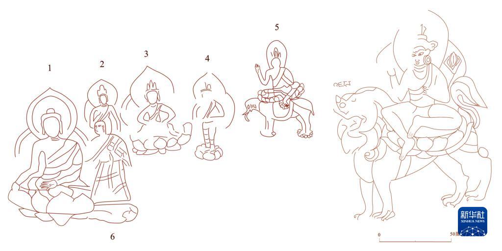 ?。ㄗ螅┎楣鳒螧點摩崖石刻造像分布示意圖,(右)然堆村騎獅文殊像。(摩崖石刻局部線圖由西藏自治區(qū)文物研究所提供)