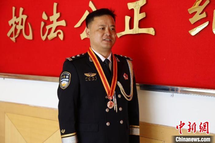 圖為獲得銅質(zhì)紀念章的民警楊軍?!「駸?攝
