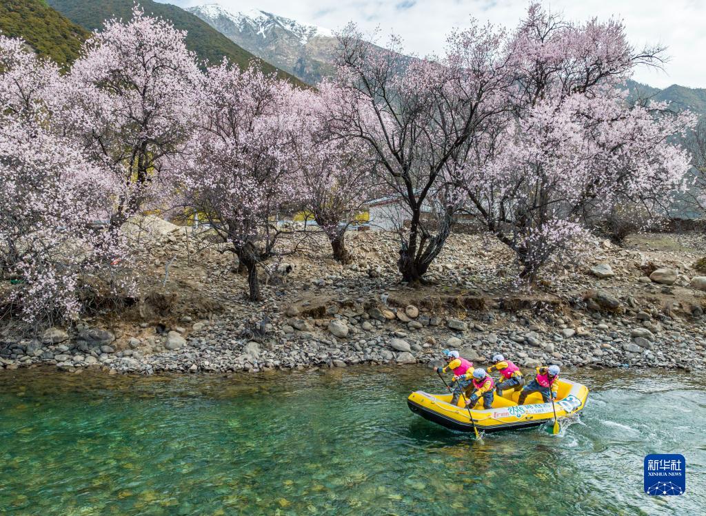 4月16日,西藏旅游股份有限公司漂流隊(duì)(前)在激流漂流筏追逐賽中。最終,他們獲得亞軍。新華社記者 孫非 攝