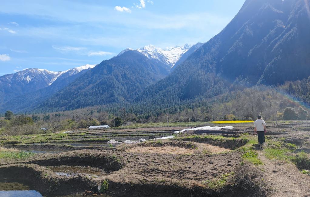 西巴村一片片沃野鑲嵌在翠綠的山巒之間,油菜花、桃花點綴其間,映著遠(yuǎn)處的雪山,勾勒出一幅色彩斑斕的圖景。