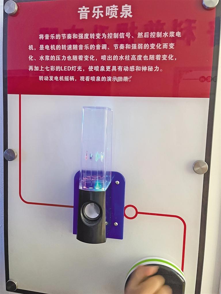“這個體驗項目叫‘天上來水’。設(shè)計者巧妙設(shè)計水流通過水泵及透明玻璃管壓入水龍頭內(nèi),在封閉的水龍頭出口處將水溢出管口,溢出的水又將玻璃管隱蔽,水流的循環(huán)造成觀眾難以發(fā)現(xiàn)特殊裝置的奧秘,從而形成人為制造的錯覺。”體驗結(jié)束后,索央向小朋友解釋“天上來水”的科學原理。
