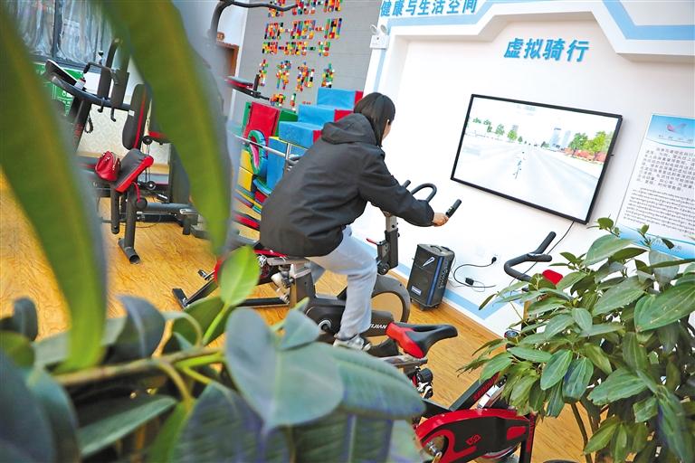 “騎上車子后,腳要用固定裝置固定好,目視前方……”在虛擬騎行區(qū),索央在大屏幕上設(shè)定好自行車對應的虛擬場景后,開始向體驗群眾示范如何正確進行虛擬騎行。