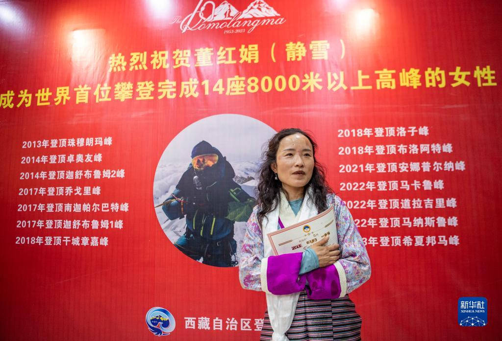 在登頂希夏邦馬峰并安全返回拉薩后,董紅娟參加為她舉辦的慶祝儀式(4月29日攝)。新華社記者 孫非 攝