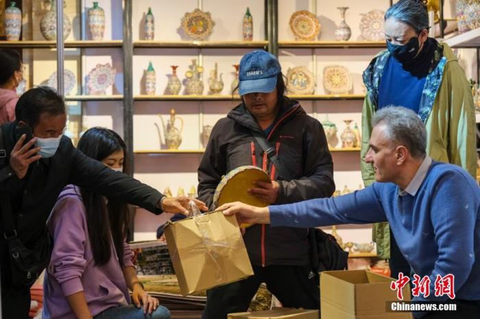 5月4日,西藏(拉薩)中外商品展銷會現(xiàn)場,伊朗商戶哈桑(前排右)給顧客打包好商品,后面貨架是他銷售的伊朗特色工藝品。中新社記者 江飛波 攝