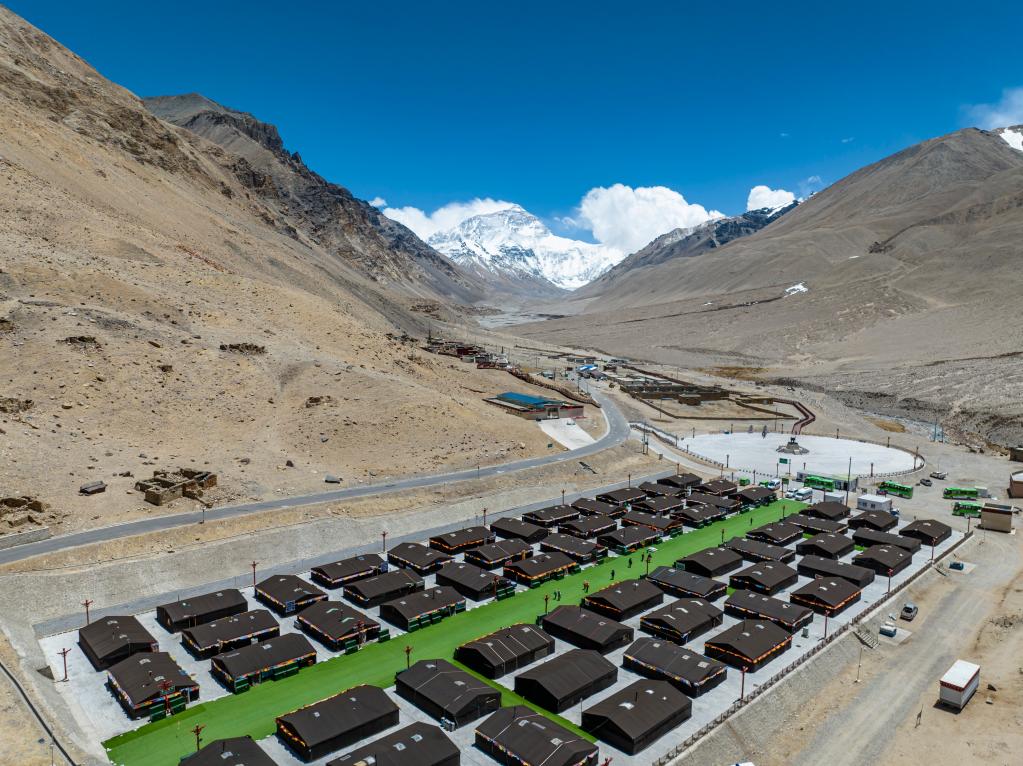 圖為珠峰游客大本營(yíng)的帳篷旅館(5月20日攝,無(wú)人機(jī)照片)。新華社記者孫非 攝