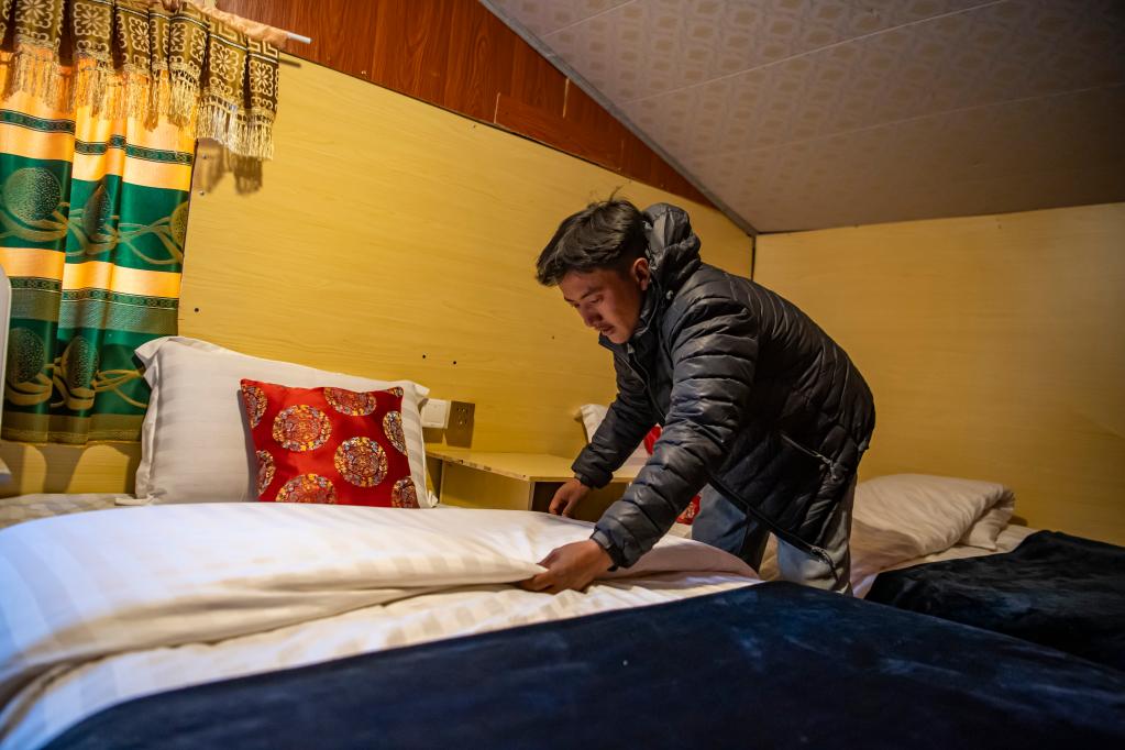 在珠峰游客大本營(yíng),旦增整理自家?guī)づ衤灭^的床鋪(5月13日攝)。新華社記者孫非 攝