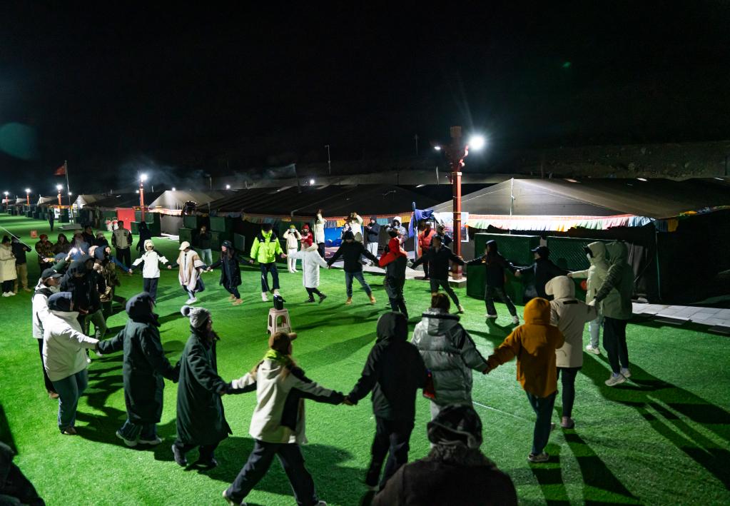 在珠峰游客大本營(yíng),游客們?cè)趲づ衤灭^間的空地上唱歌跳舞(5月16日攝)。新華社記者孫非 攝