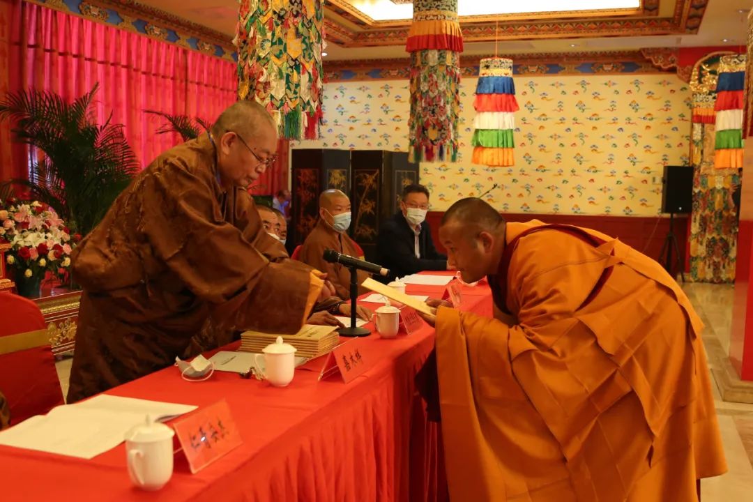 中國(guó)佛教協(xié)會(huì)副會(huì)長(zhǎng)、藏傳佛教學(xué)銜工作指導(dǎo)委員會(huì)主任、中國(guó)藏語(yǔ)系高級(jí)佛學(xué)院院長(zhǎng)嘉木樣活佛向“拓然巴”高級(jí)學(xué)銜獲得者頒發(fā)學(xué)銜證書(shū)。中國(guó)佛教協(xié)會(huì)副會(huì)長(zhǎng)、藏傳佛教學(xué)銜工作指導(dǎo)委員會(huì)副主任珠康·土登克珠活佛向“拓然巴”高級(jí)學(xué)銜獲得者表示祝賀。