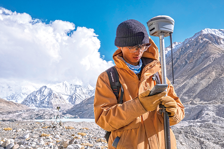 來自中國科學院西北生態(tài)環(huán)境資源研究院的科考隊員薛雨昂在對冰川進行實時差分GPS定位(5月15日攝)。新華社記者晉美多吉攝