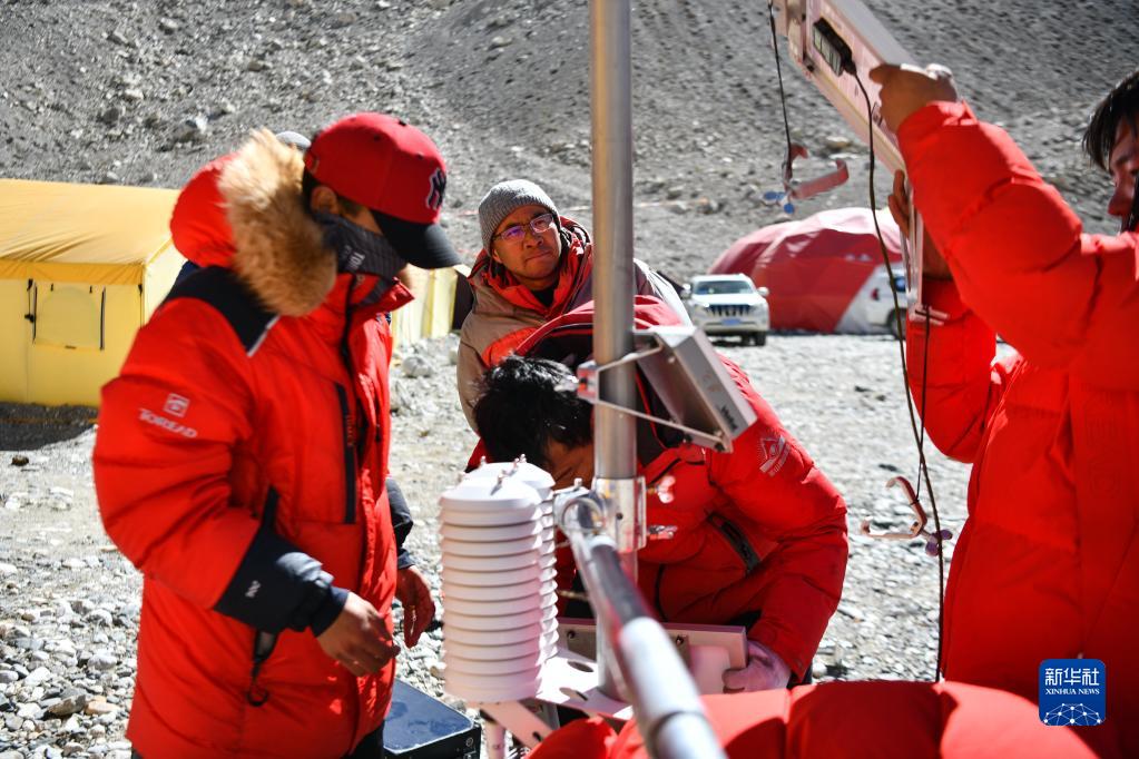 在珠峰登山大本營附近,第二次青藏科考高海拔氣象梯度觀測小組負責人趙華標(中)在指導科考登頂隊隊員架設自動氣象站(5月9日攝)。新華社記者 晉美多吉 攝
