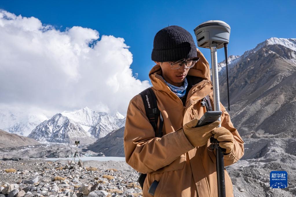 在珠峰海拔約5300米處,來自中國科學院西北生態(tài)環(huán)境資源研究院的科考隊員薛雨昂在對冰川進行實時差分GPS定位(5月15日攝)。新華社記者 晉美多吉 攝