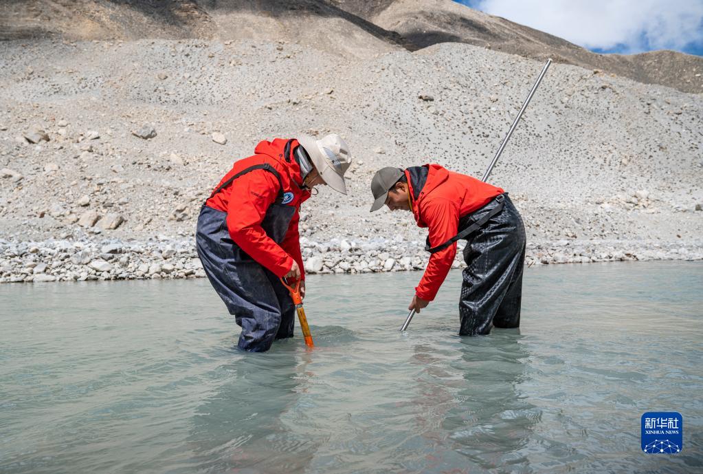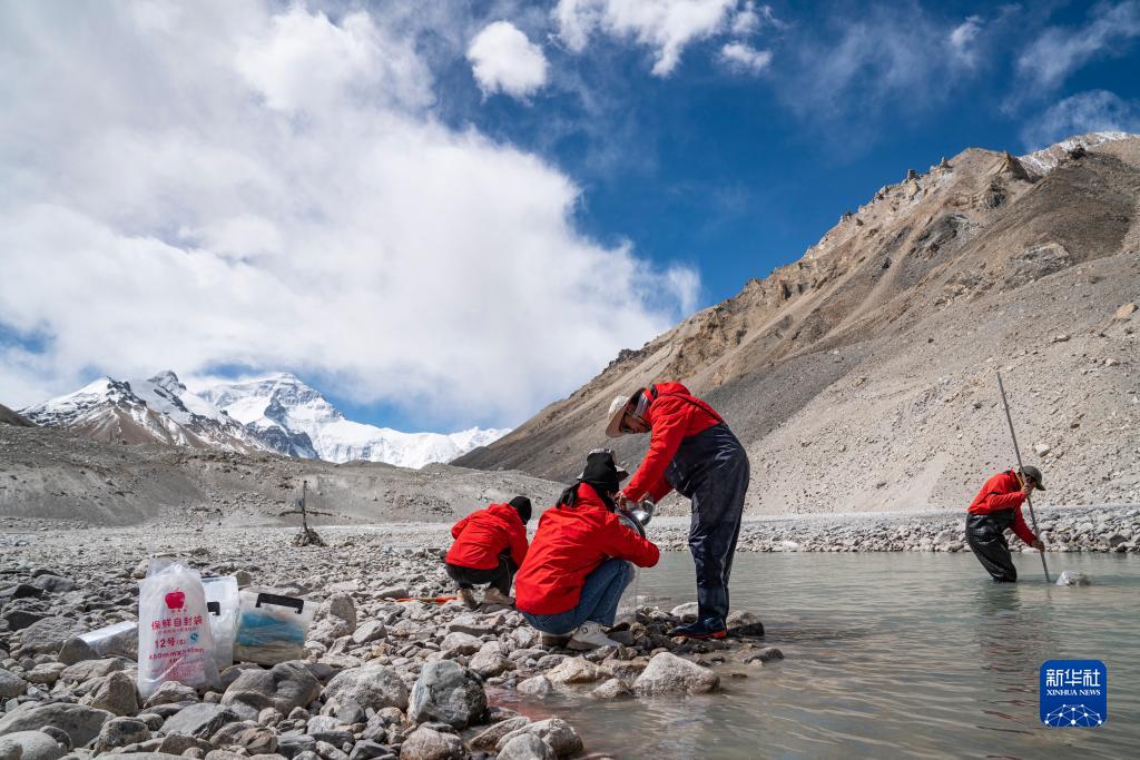 在珠峰登山大本營附近,來自西藏大學生態(tài)環(huán)境學院的科考隊員在進行水生態(tài)調查(5月22日攝)。新華社記者 孫非 攝