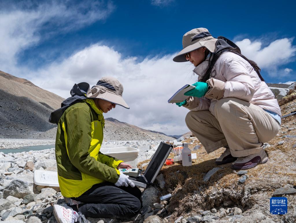 在珠峰登山大本營附近,來自西藏大學生態(tài)環(huán)境學院的科考隊員在測量土壤溫度(5月22日攝)。新華社記者 孫非 攝