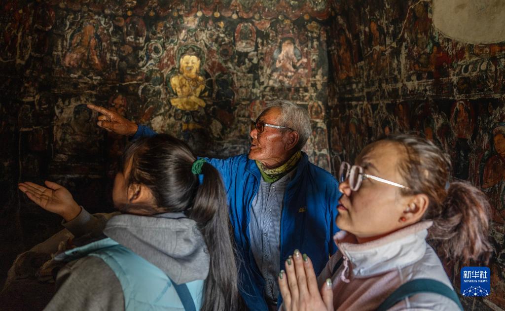 5月26日,仁增旺扎老人(中)在為游客介紹壁畫。新華社記者 費(fèi)茂華 攝