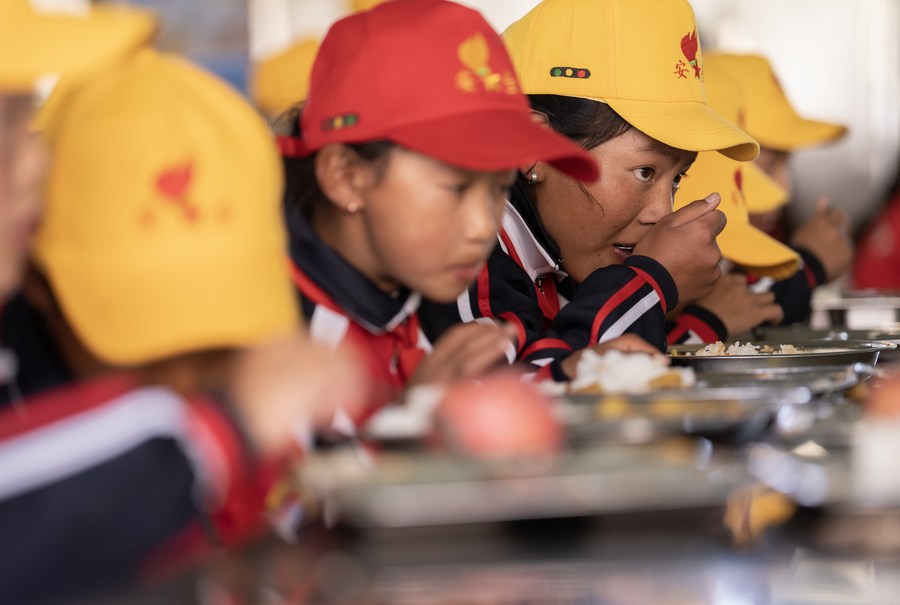 6月5日,扎西宗鄉(xiāng)完全小學的學生在食堂吃午飯。