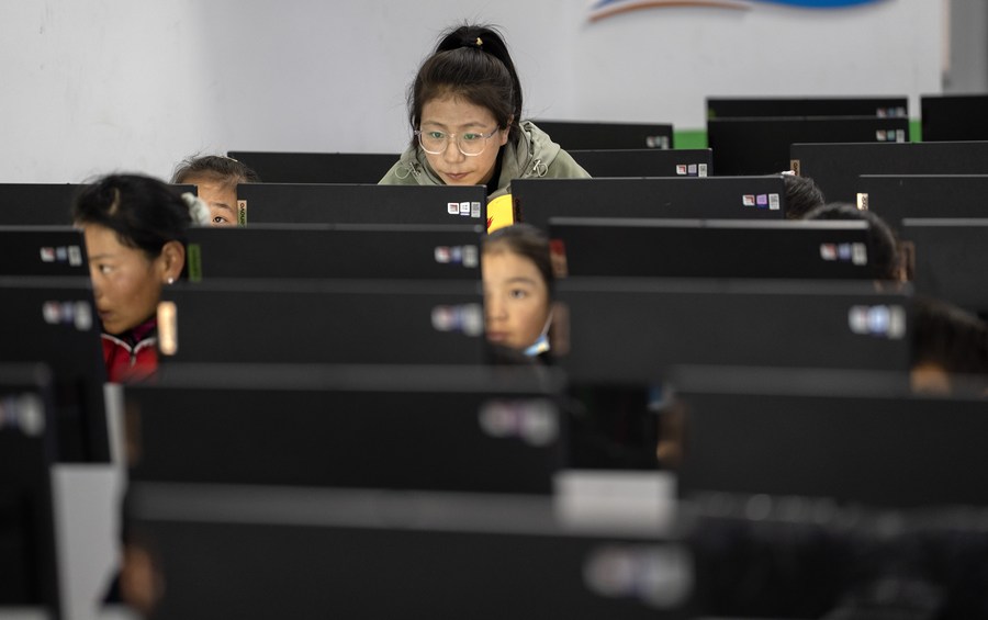 6月5日,扎西宗鄉(xiāng)完全小學六年級的學生在上計算機課。
