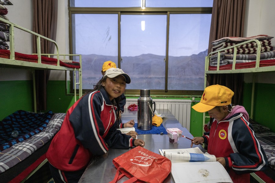6月5日,扎西宗鄉(xiāng)完全小學學生在宿舍學習。