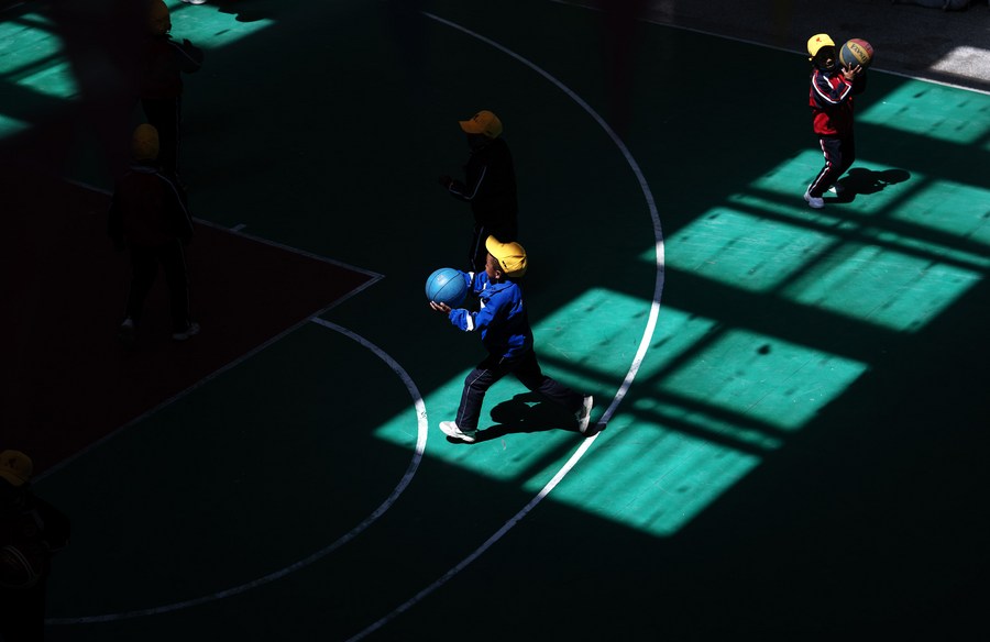 6月5日,扎西宗鄉(xiāng)完全小學學生在籃球課上投籃。