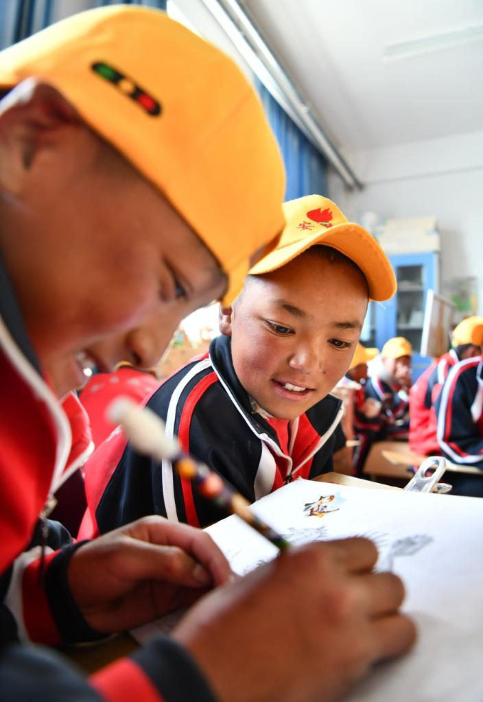 6月5日,扎西宗鄉(xiāng)完全小學的學生在上美術(shù)課。