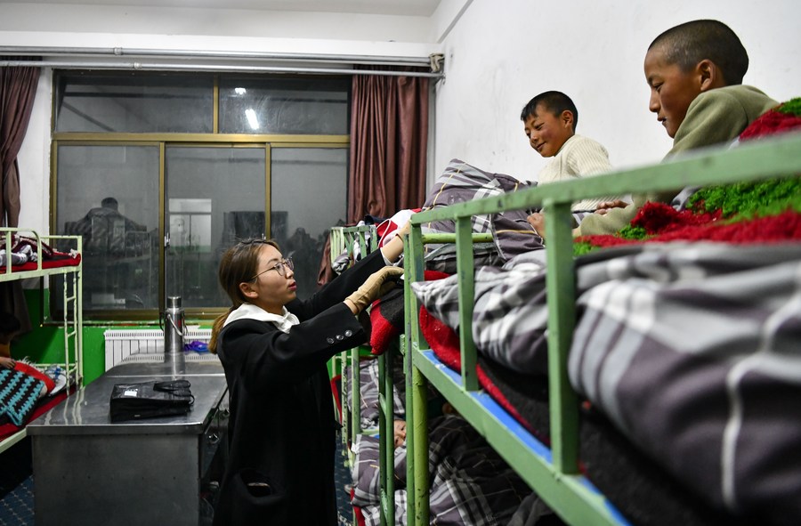 扎西宗鄉(xiāng)完全小學的值班老師在檢查孩子睡覺時是否蓋好被子(6月5日攝)。